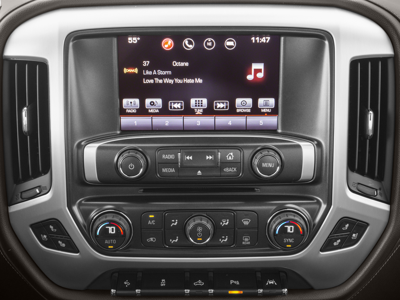 Preferred Equipment Group 4SA (110-Volt AC Power Outlet, 150 Amp Alternator, 1st & 2nd Row Color-Keyed Carpeted Floor Mats, 4.2 Diagonal Color Display Driver Info Center, Auto-Dimming Inside Rear-View Mirror, Auxiliary External Transmission Oil Cooler, Chrome Bodyside Moldings, Chrome Door Handles, Chrome Mirror Caps, Color-Keyed Carpeting, Deep-Tinted Glass, Driver & Front Passenger Illuminated Vanity Mirrors, Dual-Zone Automatic Climate Control, Electric Rear-Window Defogger, EZ Lift & Lower Tailgate, GMC 4G LTE, GMC Connected Access, Heavy-Duty Rear Locking Differential, Leather Wrapped Steering Wheel w/Cruise Controls, LED Cargo Box Lighting, LED Tailamps w/Signature, Manual Tilt/Telescoping Steering Column, OnStar & GMC Connected Services Capable, Power Adjustable Pedals, Power Folding & Adjustable Heated Outside Mirrors, Power Windows w/Driver Express Up & Down, Rear 60/40 Folding Bench Seat (Folds Up), Rear Wheelhouse Liners, Remote Keyless Entry, Remote Locking Tailgate, Remote Vehicle Starter System, Single Slot CD/MP3 Player, Steering Wheel Audio Controls, Theft Deterrent System (Unauthorized Entry), Thin Profile LED Fog Lamps, and Universal Home Remote), SLT Premium Package (20 x 9 Polished Aluminum Wheels, 6 Rectangular Chromed Tubular Assist Steps, and Bose Speaker System), Trailering Equipment, 10-Way Power Driver's Seat Adjuster, 4-Wheel Disc Brakes, 40/20/40 Front Split Bench Seat, 6 Speakers, 6-Speaker Audio System, ABS brakes, Adjustable pedals, Air Conditioning, Alloy wheels, AM/FM radio: SiriusXM, Auto-dimming door mirrors, Auto-dimming Rear-View mirror, Automatic temperature control, Bodyside moldings, Brake assist, Bumpers: chrome, CD player, Compass, Delay-off headlights, Driver door bin, Driver vanity mirror, Dual front impact airbags, Dual front side impact airbags, Electronic Stability Control, Exterior Parking Camera Rear, Floor Mounted Console, Front anti-roll bar, Front Center Armrest w/Storage, Front dual zone A/C, Front fog lights, Front Full Feature Power Reclining Bucket Seats, Front reading lights, Front wheel independent suspension, Fully automatic headlights, Garage door transmitter, HD Radio, Heated & Ventilated Front Bucket Seats, Heated door mirrors, Heated Driver & Front Passenger Seats, Heated front seats, Heavy Duty Suspension, High-Intensity Discharge Headlights, Illuminated entry, Leather Appointed Seat Trim, Low tire pressure warning, Memory seat, Occupant sensing airbag, Outside temperature display, Overhead airbag, Overhead console, Panic alarm, Passenger door bin, Passenger vanity mirror, Power door mirrors, Power driver seat, Power passenger seat, Power steering, Power windows, Premium audio system: GMC Infotainment System, Radio data system, Radio: AM/FM/GMC Infotainment & Navigation, Radio: AM/FM/GMC Infotainment System, Rear reading lights, Rear seat center armrest, Rear step bumper, Rear window defroster, Remote keyless entry, Security system, SiriusXM Satellite Radio, Speed control, Speed-sensing steering, Split folding rear seat, Steering wheel mounted audio controls, Tachometer, Telescoping steering wheel, Tilt steering wheel, Traction control, Trip computer, Turn signal indicator mirrors, Variably intermittent wipers, Voltmeter, Wheels: 18 x 8.5 Polished Aluminum, and Wireless CharginG.
